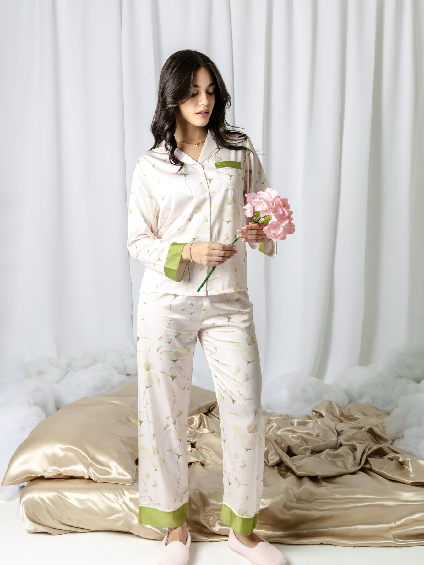 El Pijama Gardenia combina un tejido satinado (poliéster con spandex 4%) que aporta suavidad y comodidad con un corte largo pensado para moverse libremente al dormir. Set de 2 piezas con camisa manga larga abotonada y el pantalón largo ofrecen una silueta clásica. Disponible en S, M, L, XL y en dos colores: Gardenia Rice y Peach Pink.